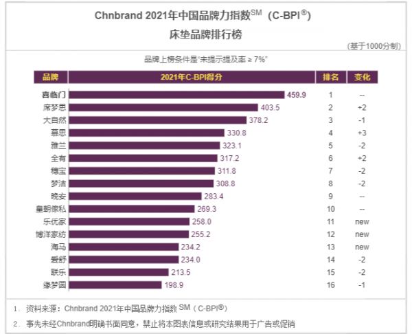 来自中国企业品牌研究中心的数据显示,2021年中国床垫品牌力指数( C-BPI ),喜临门以459.9分排名第一,这是喜临门第九年获得品牌力第一的成绩。席梦思、大自然、慕思分别以403.5、378.2、330.8分,位列第二、三、四名。