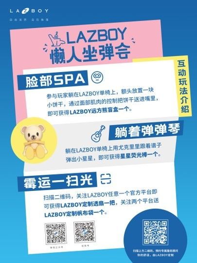 LAZBOY在夏日音乐祭副舞台和展篷位置,为游客准备了很多趣味互动游戏和各种福利。副舞台以懒人坐弹会为主题,游戏都在LAZBOY沙发单椅上进行,包括谁是老司机、眼色游戏、猜词游戏、猜歌名游戏和脸部SPA。展篷位置的互动都有奖品相赠,游戏有躺着弹弹琴、脸部SPA和霉运一扫光,游戏互动成功即可获得精美好礼。