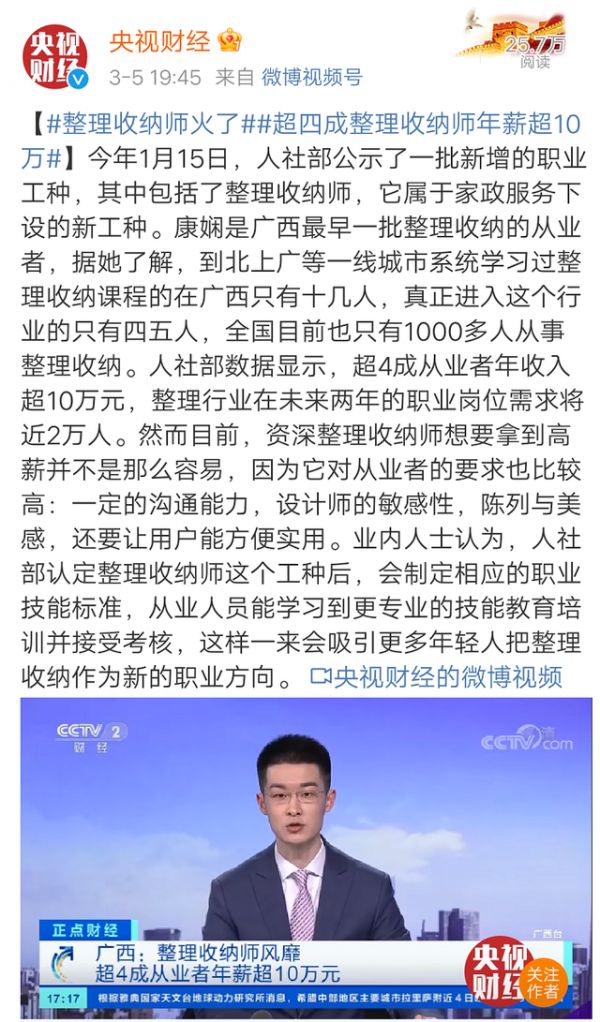 今年1月15日,国家人社部公示了一批新增的职业工种,其中包括整理收纳师。收纳师属于家政服务下设的新工种,即将作为国家承认的正式职业与大家见面。今年两会期间,在解读“十四五”蓝图时,央视新闻也特别点名“整理收纳师”,作为国家发展现代服务业的代表和时代的风口职业。