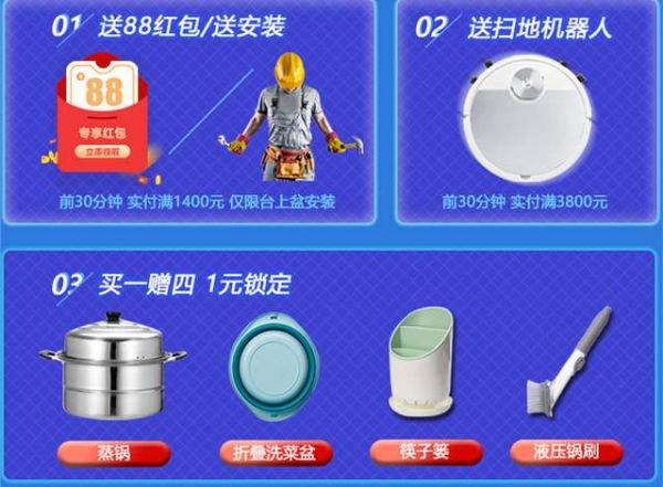 活动时间:6.1日-6.3日,即享受平台满减200即减30,限时9折活动,前30分钟送88红包并赠送安装服务(实付满1400,仅限台上盆安装),实付满3800送扫地机器人一台。惊人福利店铺券:满1000减100,满2000减200,满3000减300,满4000立减600!!!还有1元抢豪华大礼包的优惠,可获得折叠洗菜盆,筷子篓,液压锅刷,蒸锅四大实用家居好物,联系客服还可领取皂液器哦。直播间福利多多,关注主播送平板拖把,直播间抽红包,20元,50,100元现金红包抢不停,还有折叠垃圾桶,菜板,三层置物架、扫地机器人,限时下单第一名请你喝1杯奶茶哦!