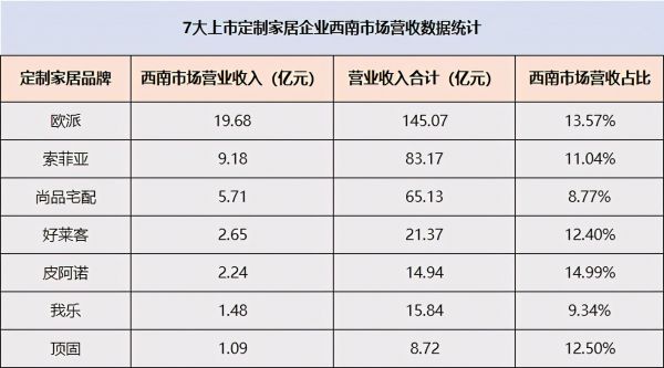 据财报数据显示,7大上市定制家居企业在西南市场的营收占比平均在12%左右,其中欧派近14%,索菲亚11%,尚品宅配近9%,好莱客12%,皮阿诺近15%,我乐近10%,顶固近13%,西南市场的营收占比份额不容小觑,同时也意味着仍有广阔的发展空间。另外,志邦在西南市场的增速达30%左右,其西南市场发展迅速。