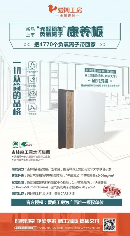 爱阁工房与国内知名板材制造企业吉林森工达成战略合作关系,是吉林森工露水河“无醛添加”负氧离子康养板(甲醛释放量≤0.04mg/m³)广西指定合作运营商。该板材具有持久释放负氧离子、净化空气、分解甲醛的功效,并已通过美国CARB认证、日本F☆☆☆☆认证等国际权威认证,致力于为消费者打造健康养生的居家环境。卓越的品质、优异的环保性能和特殊的净醛功能是其他板材所不具备的,在市场上具备显著竞争优势。