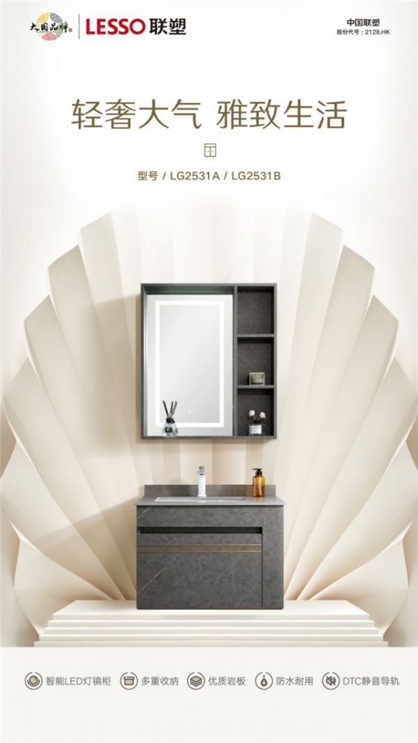 从收纳设计到防污防潮处理,“颜值加分细节满分”的联塑浴室柜成为卫浴空间一道靓丽的风景。联塑浴室柜从产品外观、收纳性能等细节入手,采用当下流行的岩板元素以及五金收纳系统,解决了空间搭配和收纳储物的用户刚需,为用户带来更个性化、更简易便捷的新体验。独特的镜柜设计为空间增添了灵气,大尺寸的镜面满足了梳理整理的需求。同时,通过优选银镜配合LED美颜灯,高清成像不失真,让你把握更多美的细节。