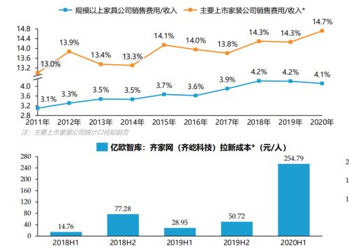 制作门槛高、营销成本高无疑是家居企业拥抱视频营销的两大掣肘。调查显示,2020年主要上市家装公司平均销售费用率达14.7%,线上家装企业的拉新成本从2018年的14.76元上涨至2020年上半年的254.79元。企业竞争性营销支出上升,竞争加剧的趋势下,如何使营销效率提升,亟需一个解法。