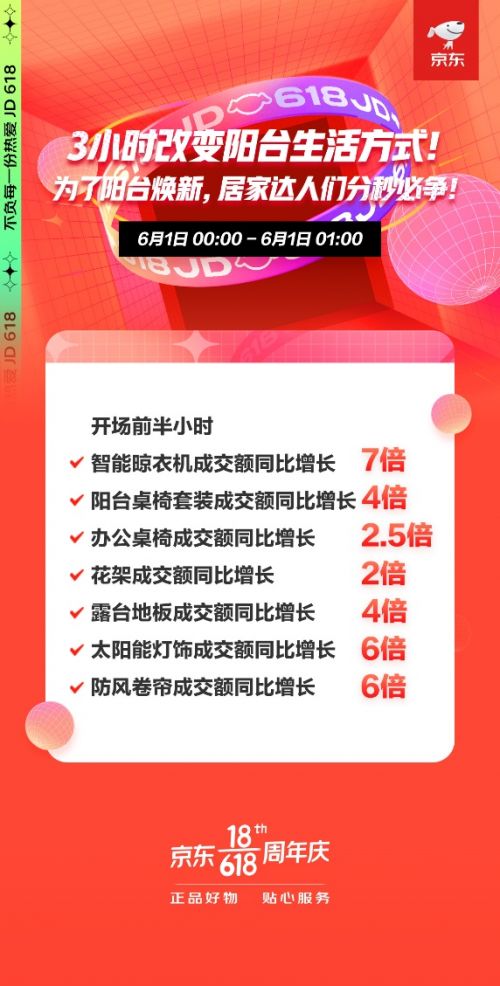 6月1日,京东居家在全民购物狂潮中迎来开门红,开场10分钟,成交额同比增长120%,再创新高。其中,阳台空间相关品类销售成绩喜人,智能晾衣机、阳台桌椅套装、办公桌椅等居家好物人气爆棚,掀起了阳台空间升级的热潮。