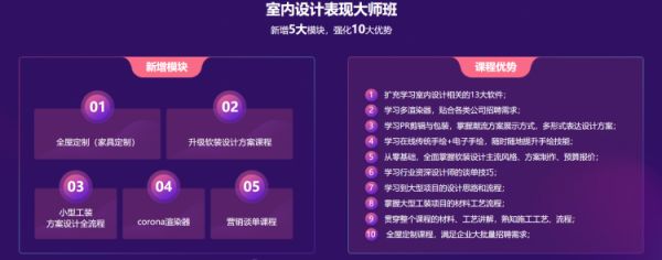 据介绍,全新升级和匠心打造的课程,新增全屋定制、软装设计、小型公装、Corona、营销谈单五项市场需求内容,升级后将拥有全屋定制、软装设计、材料工艺、营销谈单、多渲染器、剪辑包装、选修手绘、大型项目、设计深化、行业软件十大优势,全面提升学员技能点,助力室内设计师快速成长,成就设计梦想,实现设计价值。