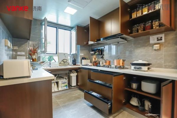 敞阔的厨房设计,洗、切、烹饪一气呵成,于方寸之间调和美味。为满足业主的收纳需求,特别定制超大收纳容量的橱柜,餐具、调味品、厨具分类放置更加整洁又便捷。在细节上,操作台面设计挡水条,让烹饪过程中产生的水渍更容易清洁。