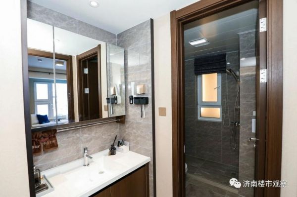 万科繁荣里的卫浴空间采用干湿分离设计,若男主人在浴室给孩子洗澡,溅了一地的水花,也完全不会影响在另一边梳洗装扮的女主人。而且储物镜柜与浴室柜相结合,美观实用,有足量空间满足男女主人存放洗浴用品、护肤品等生活所需。