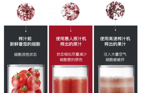 惠人榨汁机由主机,透明前体,螺旋推进器等组成,仿照小石磨榨汁原理,慢速压榨技术是一种源于柠檬压榨器的榨汁方法,在高压下对新鲜的水果和蔬菜进行慢速挤压,将原汁原味的果蔬汁榨出,保持新鲜水果和蔬菜的味道和芳香,一方面将流入的空气最小化,减少氧化,改善果汁营养流失以及分层和大量气泡的问题;一方面慢速旋转降低了机器运转中产生的热量,更好的保护水果的营养,避免果糖酸化的过程,保留了果汁的甜蜜口感,即使不添加色素及增味剂,果汁口感色泽也非常好,这也是很多果汁店使用惠人榨汁机做鲜榨果汁的原因。