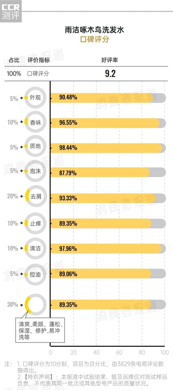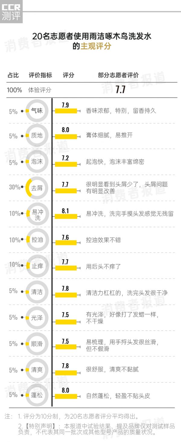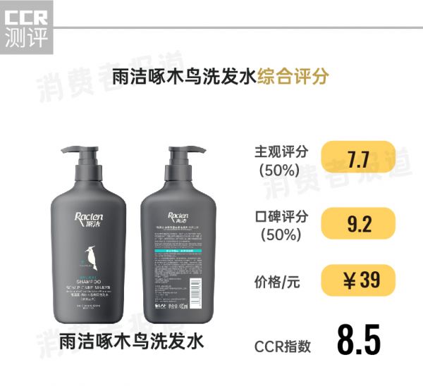 结果显示,这款雨洁啄木鸟洗发水的综合评分为8.5分,值得推荐,尤其在去屑效果上值得推荐,20名参加体验的有头屑烦恼的志愿者头屑评分2周内从5.0分提升到8.0分,“头屑很明显看到减少了”;电商评论的好评率高达93.3%,“(洗发水)像个啄木鸟,头屑好比就是树上的虫子,用了它就把虫子都吃光了”。