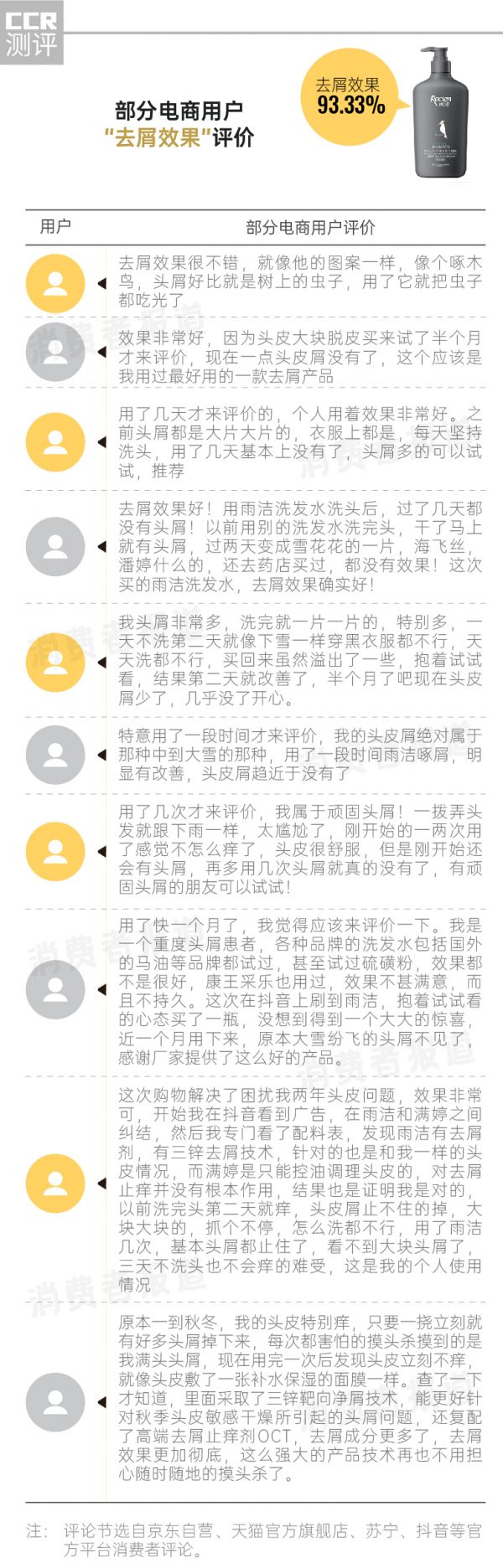 去屑洗发水体验、口碑报告:去屑好评率高达93%,消费者表示“像啄木鸟一样,将头屑吃光”