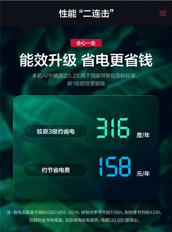 节能Ⅱ代带来的是更省电的空调,也是更环保节能的理念。我们的家电要能买得起,也要用得起;我们的生活要自家环境好,要地球环境也更好!