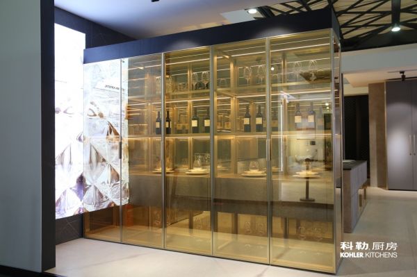 科勒橱柜晶至系列用金色镀膜玻璃打造全透陈列柜打破空间隔阂