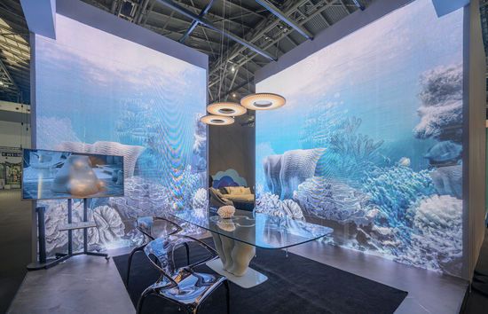 由 Antoine Fritsch & Vivien Durisotti 设计的 Corail 餐桌,是 Roche Bobois 罗奇堡2021春夏新品的主打创新款,每一件 Corail 都独一无二。作为一款3D打印产品 ,其环保性和可再生性是生产者与消费者共同关注的话题,同时在设计上也能满足消费者的个性化定制需求。Corail 餐桌形状使人联想到的暗礁上的珊瑚群落或巨大的巴洛克贝壳,灵感来自于自然界中的不完美之美,可以让它的主人自由发挥想象力。Corail餐桌的底座是3D打印的混凝土材质,此次的一项重大创新是我们的线上软件,客户可根据自己的喜好对底座的形状和大小,包括是否需要编织效果来进行“设计”,探索更多美学可能性。结合展厅独有的海洋珊瑚场景,这是一次科技与自然的交相辉映,自然美学与未来生活的和谐共生。
