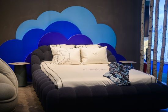 Sacha Lakic 的另一项产品 Bubble 床 是 Roche Bobois 罗奇堡 Bubble 系列的首创床品,作为沙发系列设计产品的延续,首次推出卧室系列。在本次设计上海的亮相也是Bubble床在中国的首秀。Bubble床拥有和沙发一样的外形设计,如云朵和泡泡一般充实而柔软。整体呈现出圆润曲线的造型,由一个个独立的泡泡组合而成。面料同样采用罗奇堡特有的 Techno2D、3D或4D面料,有多种尺寸可选。和 Bubble 系列的其他产品一样,它是舒适的象征。展厅内部真实还原了家居生活场景,好似带你进入云朵般的梦幻场景。另外,此次展会特别鸣谢高端家庭影音娱乐品牌 CINEMORE 给予赞助支持。