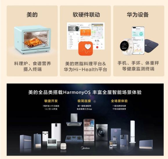HarmonyOS让设备不分你我,自由组合,不再有设备孤岛。在万物互联的环境下,没有一家企业能孤立地发展。美的与鸿蒙系统的结合,突破了单一物理设备硬件能力的局限。围绕健康场景的运营是智能厨电的未来,美的深入探索关于鸿蒙带屏设备的场景交互,从硬件、软件、内容三方面打造燃脂闭环管理。用户可以通过美的智能燃卡蒸烤料理炉S5 Mini健康烹饪程序平衡营养摄入,利用华为鸿蒙系统掌握运动手表、体重秤等健康监测信息,通过美的燃脂料理平台和华为Hihealth系统进行多维健康管理,全面掌控饮食状况。