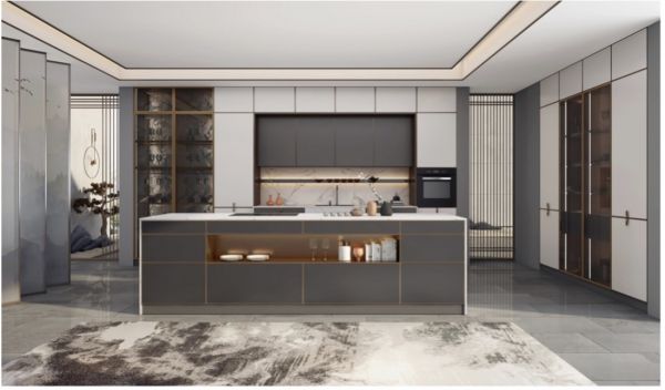 柏厨推出的中隐系列融合中国传统文化与现代时尚元素。拉手和门板的独特设计打破呆板感,隐藏式拉手设计,内嵌中国文化元素图案的金属装饰片,与门板设计浑然一体。圆弧纹样哑光靛蓝色玻璃寓意“圆满”,方形水纹金属饰片寓意“财源滚滚,顺风顺水”,天圆地方,兼容并蓄的东方内涵不彰自显。门板搭配两款寓意圆满的金属装饰,打破传统定制门板单一呆板的印象,简约大气,细节考究,尽显意会东方的设计内涵。门框采用25mm北美赤桦木指接板贴黑胡桃木皮实木边框;芯板采用MDP(进口全松板),表面贴黑胡桃木皮,或正面外贴4mm仿岩板玻璃,尽显表里如一的大家气度。