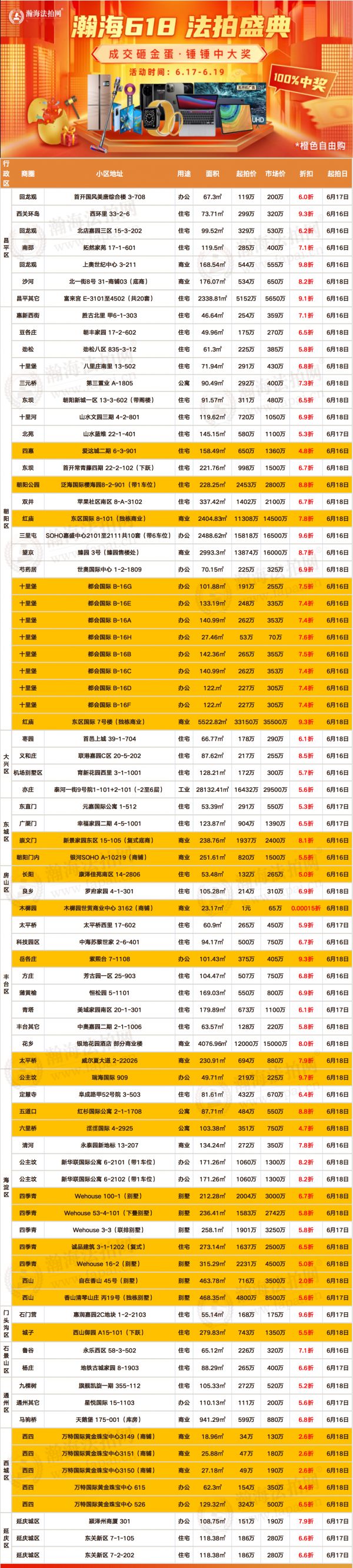 瀚海法拍网作为国内专业的司法房产辅拍平台,在年中法拍狂欢之际推出“瀚海618法拍盛典”,凡是6月17日-19日期间在瀚海成交且支付全额服务费,即可参与砸金蛋活动,中奖率百分之百。奖品众多,有华为叠屏手机、周大福传承系列黄金、MacbookPro、iPhone12pro等精彩豪礼,宠粉狂欢,为法拍购房者带来更多专属福利!