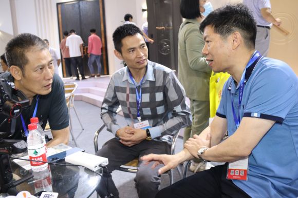 周天金董事长(左)、胡旭总经理(中)与邱日祥主任(右)深入交谈