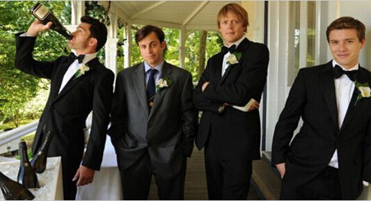 2、如果新郎穿的是深蓝色西装,那么里面穿一件白色衬衫或者蓝色衬衫都是可以的,再搭配颜色深一点的领带,这样看上去也很时尚。