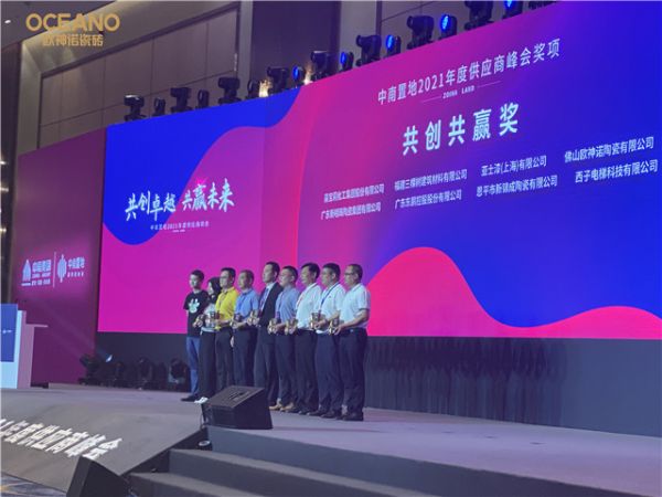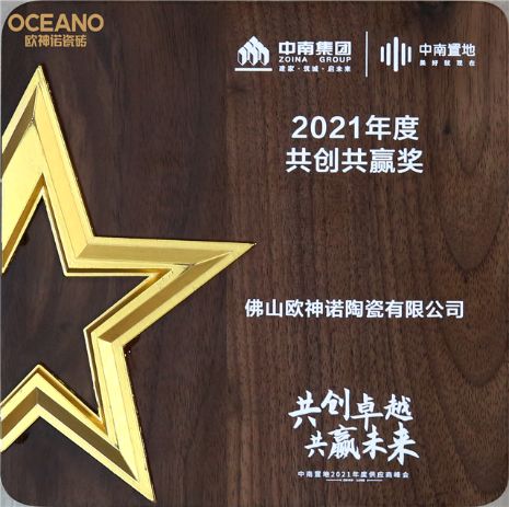 5月31日,中南置地2021年度供应商峰会在上海隆重举行,佛山欧神诺陶瓷有限公司凭借出类拔萃的产品质量、专业硬核的工艺技术与贴心高效的产品服务,荣获中南置地“共创共赢奖”。