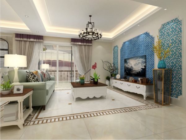 以白色为整体基调的客厅,墙面辅以小面积的蓝色、绿色为点缀,给原本敞亮的空间增添清新爽朗的味道,蓝色、绿色马赛克的点睛之笔,让空间的气质焕然一新。旁边再添几株绿植装点,简约的家具配上鲜活的色彩,营造出一种自然清新的空间氛围。