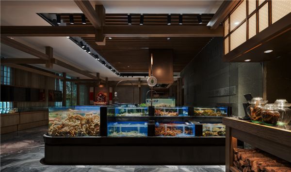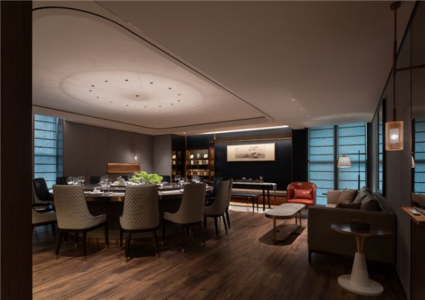 类似江南园林的回廊结构被运用到空间中,园林中走马廊所围绕的中庭和庭院被海鲜明档和宴会厅替代,两者一小一大。包厢取意江南书房,箔卷半窗,借四周景致,露点碧翠,清晨薄雾弥漫、隐隐约约,纵情于自然的同时,体验时光静淌,似沉静在一派书香庭院之中。