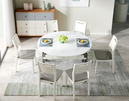 此款餐桌实用性十足,具备伸缩折叠功能,收起是长桌,打开变圆桌,灵活多变可适配大小户型。一桌多款台面,可以根据不同家庭的需求选择岩板或钢化玻璃台面,耐划耐磨耐高温,适配性强,实用百搭。