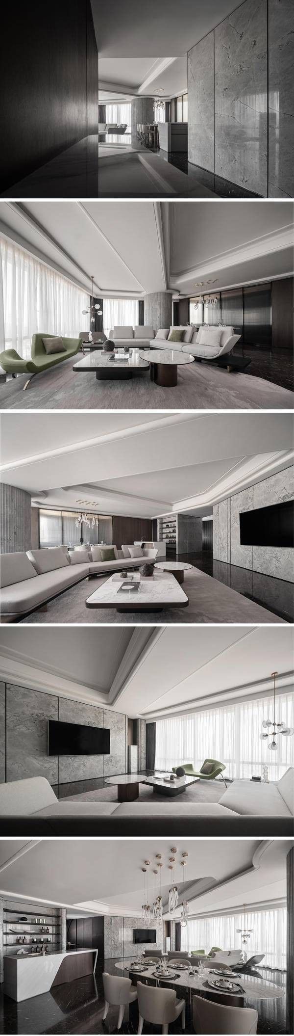 软装以颇为现代的手法铺陈,石、木与皮革为空间奠定高级的灰色调,沙发、地毯、餐椅则以此为基点形成色彩统一的整体性。虽然整个空间以灰色系为主,在局部添置大自然中绿色织物作为点缀,突出整体的时尚感和活力。