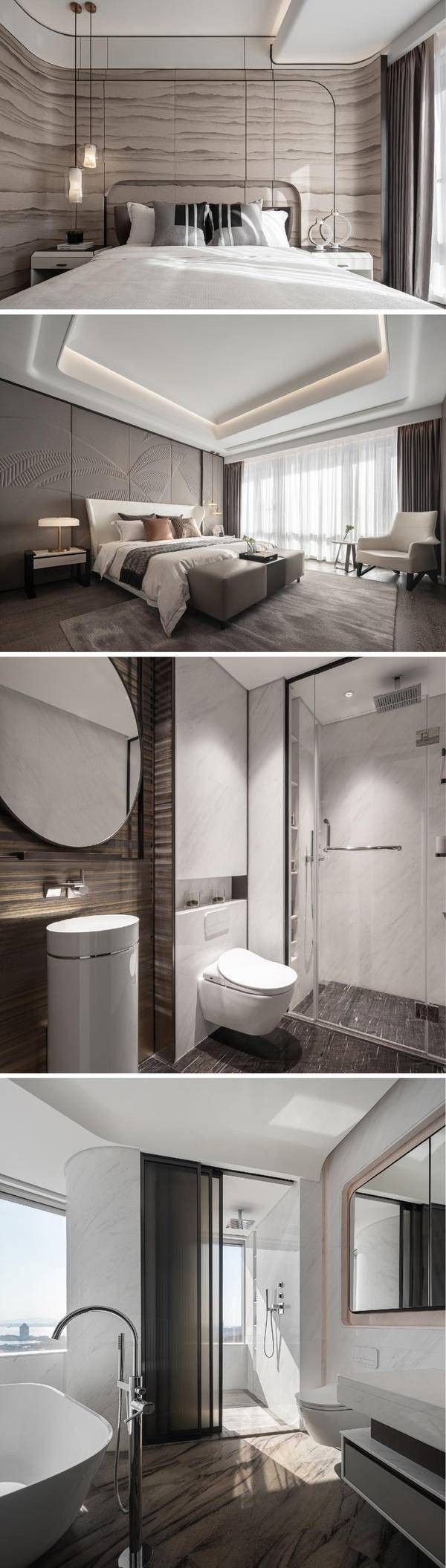 整个项目除了将山、水元素作为灵感,还将游艇内饰的线条注入三间卧房,主卧更是以皮雕工艺将海浪的形态抽象化展现于背景墙之上,深邃的质感与雅致灰色形成极强的张力,让居住氛围充满低调奢华的气质。三间卧房中有两间为套房的形式,将空间利用率发挥到极致。