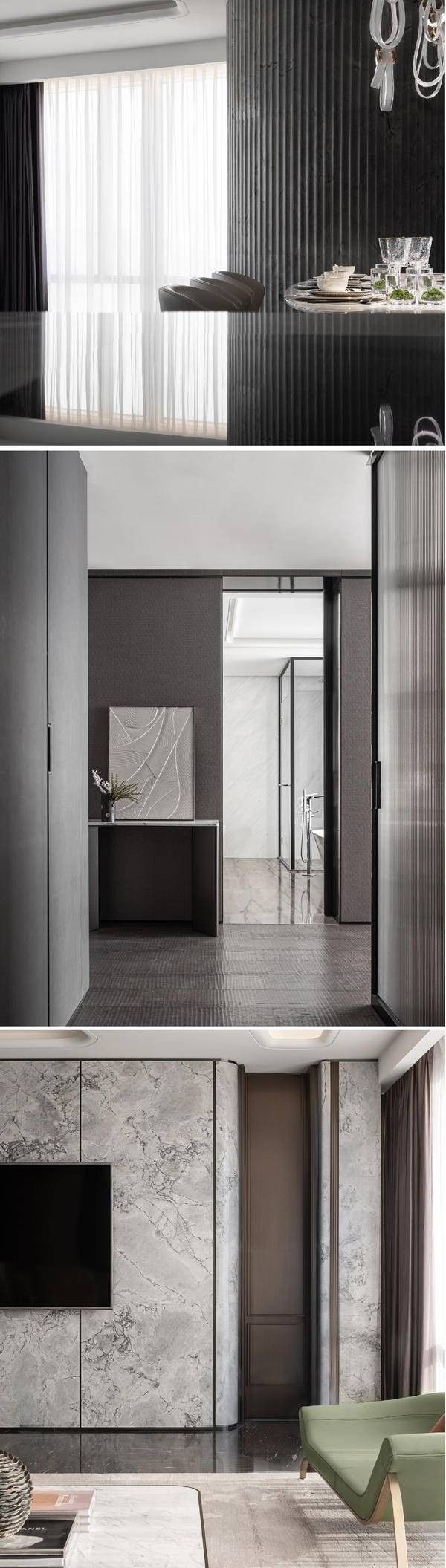 鱼肚白大理石拥有水墨画般的自然肌理,是呈现山水之境的最佳石材,它的应用从玄关处开始便为空间注入强势的奢华气质,进而向客餐厅的背景墙、酒吧台延伸。室内承重柱也用奢华大理石做弧度切面包覆,藏在细节里的艺术之美。深棕色尤加利木料与深色高级皮革穿插在大理石之间,构成温度上的过度,在刚与柔之间让空间质感达到微妙平衡。
