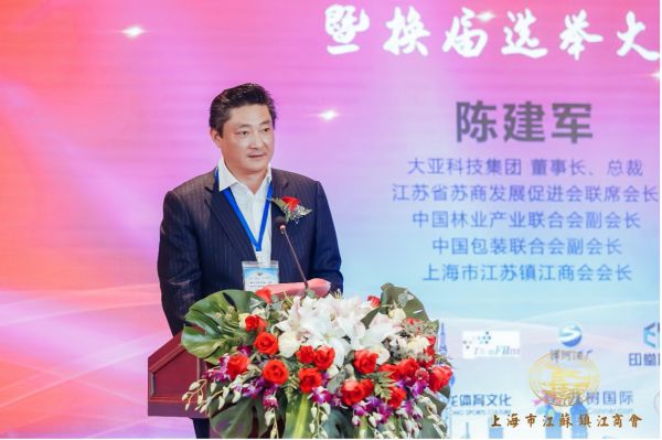在上海市镇江商会第二届第一次会员大会上,第二届新当选商会领导班子集体亮相,商会新当选会长大亚科技集团有限公司董事长、总裁陈建军作了就职演说。