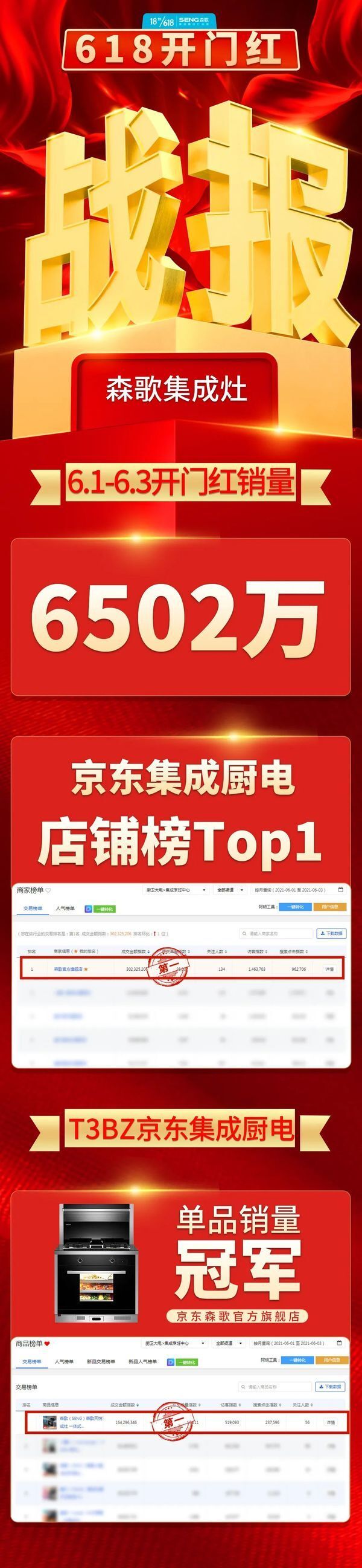 旗开得胜,全力冲击!森歌618开门红线上销售突破6502万,京东集成厨电店铺榜Top1~