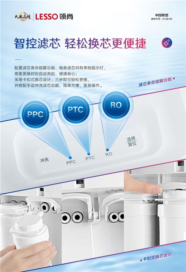 同时为了解决用户不懂滤芯如何更换的问题,领尚反渗透净水器采用了人性化的卡扣式滤芯设计,三部即可轻松更换,无需专业人士上门,自己也能轻松更换滤芯。