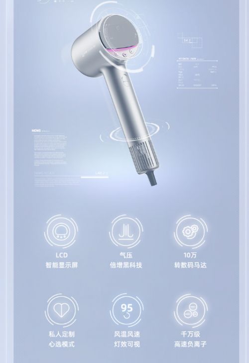 这款吹风机首次突破运用LCD智能显示屏,实现风机面板精准控制;同时还有15种风速组合(三挡风速、四挡风温、冷热循环风),可以全面满足用户需求;定制航天级叶轮,高速V-MAX先锋马达,推动强劲风量快速干发;气压倍增黑科技,两倍风压快速风干吹走头发表面水分,保护发芯健康;高速负离子,负离子附着率高,更好养护发芯;冷热循5s环风交替,进一步降低头发表面温度等等。