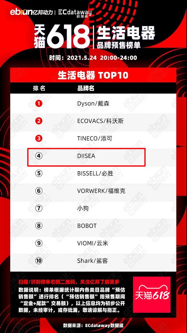 而早在预售期,DIISEA滴水洗地机也是被李佳琦二度选中,产品力和创新力获得选品眼光老辣的头部主播高度认可,在一众国际大牌中脱颖而出登上直播间热门位,成为当日主推。同时在天猫618生活电器品牌预售榜单中,DIISEA滴水以黑马品牌之姿力压行业老牌登上TOP4,成绩可谓相当亮眼。