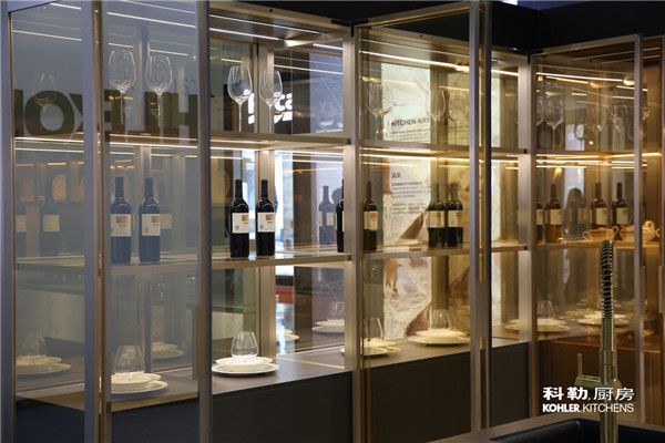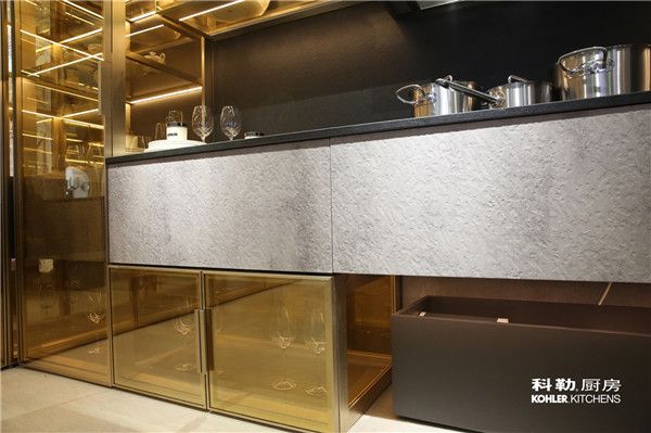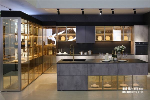 科勒橱柜晶至系列用金色镀膜玻璃搭配特调罗曼铜色窄框设计