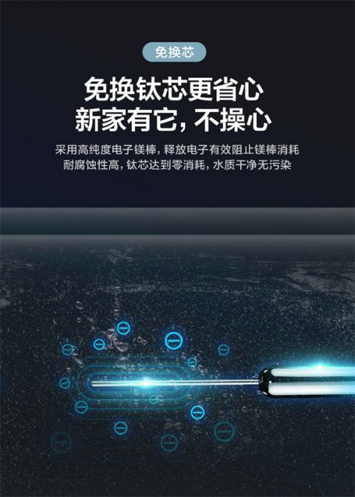 免换电子镁棒,通过释放电子有效阻止镁棒消耗。耐腐蚀性高,钛芯达到零消耗,水质干净告别污染。不必定期更换耐久使用,新家一用到底毫不费心。