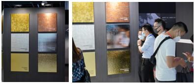 往里走的左侧墙面展示的是富美家®金麗®金属系列,产品主打的是复古风,商业空间尤其青睐此类材质表面。现场有不少观众驻足观赏:轻复古设计与空间色彩的碰撞有着极度和谐的默契,复古彰显永恒,色彩极具个性。即使同为金色,也有着不一样的表面处理,打破空间的界限,展示独特的魅力。