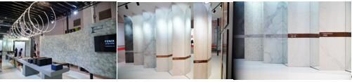 现场富美家®的展厅犹如一条长条形的时光隧道。观众在入口处可以看到,富美家®耐火板屏风式的排列造型,包括大理石花纹,石英石花纹等自然图案,两面体型巨大的造型墙相对而出,唤醒人与空间的共鸣;在材质的碰撞、色彩的依存、形状的磨合中,营造纯粹的自然美学。