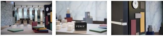 来到展厅中央区,观众会被桌面的正方体和墙面的方形色块所吸引,这就是高科技智慧材料FENIX®。简洁而充满科技感的材质,通过线条、色块、立方体的排列,完成了超现实主义的时尚潮流设计;其绚丽的色彩融合,带领场景中的每一个人探索空间的奥秘,让空间不再只是一个方正的躯壳。