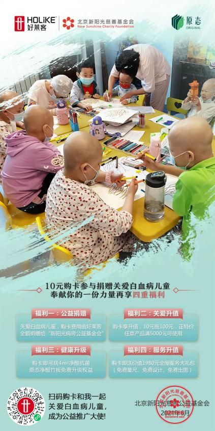 爱心传递,公益继续。此次6.1原态公益行作为好莱客原态公益月第一波行动已圆满结束,更多原态公益行动接棒而至:扫码10元购买好莱客原态爱心卡,活动所筹得善款将被汇集捐助至北京新阳光慈善基金会,帮助白血病患儿重获健康;6月15日晚19:00,好莱客“爱baby,选原态”关爱专场大型全国公益直播也将温馨开场,全民见证大爱力量。