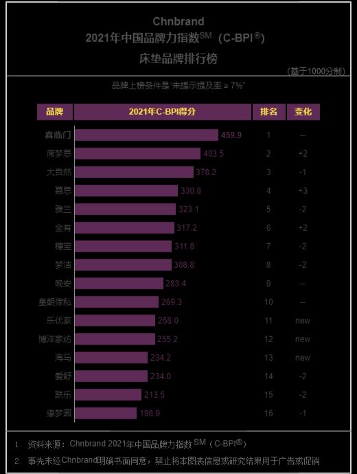 正是如此,凭借较高的品牌认知度、品牌忠诚度和品牌美誉度,喜临门连续6年、总共9次问鼎工信部认证的“中国品牌力指数”第一品牌。相比之下,慕思曾入围过7次“中国品牌力指数”,最好成绩为今年的第4名,而梦百合则没有入围。
