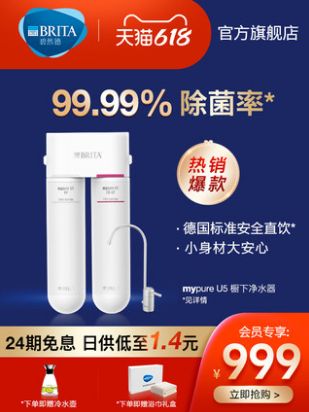 618期间登录碧然德官方旗舰店,领取专属优惠券,即可劲省1500元,不到1000元轻松拿下这款小巧而精致的碧然德mypure U5橱下净水器,叠加24期免息,日供最低可至1.4元/天。