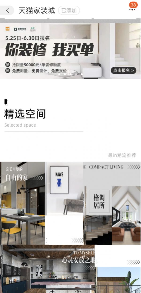 2021年,天猫重启装修服务,与头部装修企业联合为全国消费者提供“靠谱”的装修服务。618期间,百安居、圣都、生活家装饰提供全国50个城市的“免费测量、免费设计、免费报价”服务,并在部分城市提供5万元装修基金,回馈用户,活动也已第一时间在天猫家装城频道上线。