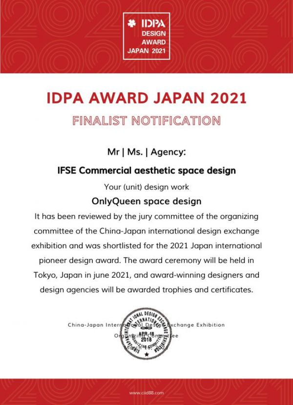 在2021日本IDPA AWARD国际先锋设计大奖公布全球入围名单,知名空间设计师、IFSE双邑商业美学空间设计创始人吕莉参赛作品《一后珠宝》美学空间荣膺2021日本IDPA AWARD国际先锋设计大奖。