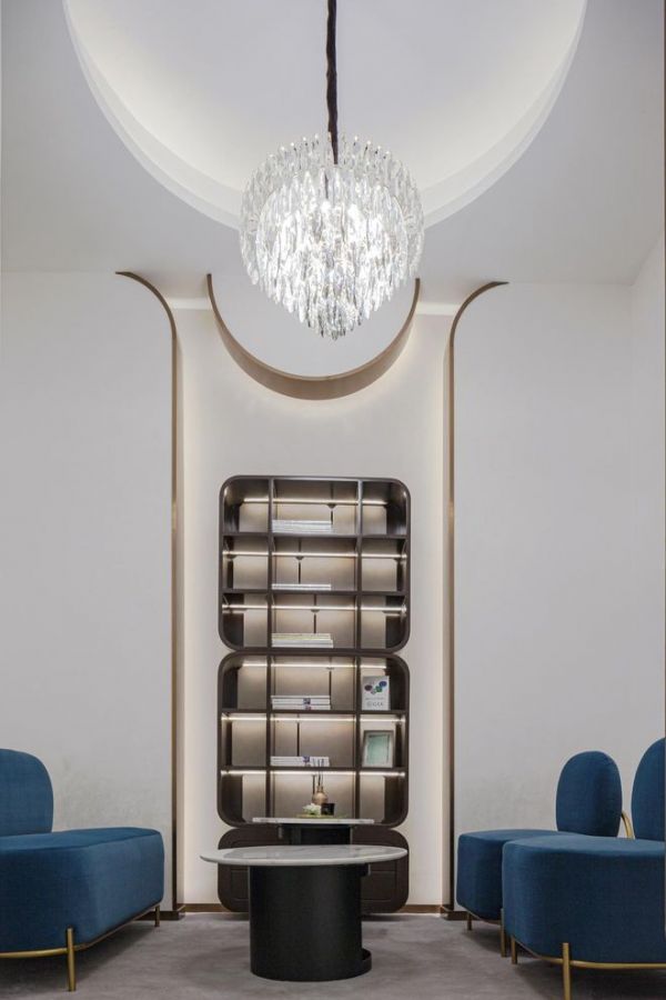 一后珠宝的品牌色贵族蓝以不同形式点缀在空间中,产生多层次的视觉效果,为空间增添优雅、沉静的味道。流畅简练的线条以不同材质为载体在空间中流动,辅以造型灯具,在平静且克制的语境中,注入美学情趣,营造出时尚、高级、简约的空间氛围。本案的设计思考中,最核心的重点是,希望通过终端空间的打造为消费者呈现一种独有的生活姿态和感官体验,提供优雅又美妙的氛围空间。