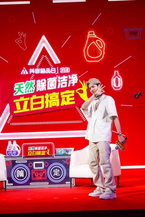 为了更好地拔高品牌势能,围绕超品日活动,立白通过创意视频、挑战赛、明星达人直播等创意玩法,持续吸引人气。在4月24日爆发日邀请品牌代言人吴亦凡来到直播间与消费者互动,打通内容种草场景与直播带货场景,将生长于内容IP的品牌影响力传导至销售环节,进而开辟品-效-销协同增长的新通路,以音综内容为起点,通过明星花式口播“天然除菌洁净 立白搞定”品牌slogan、立白定制开箱时刻、明星创意中插等环节,对产品利益点进行了深度演绎,进而引导粉丝参与后续上线的抖音互动活动。并运用硬广曝光、抖音挑战赛、出圈短视频、品牌自播等“组合牌”,品-效-销三管齐下,实现协同增长。