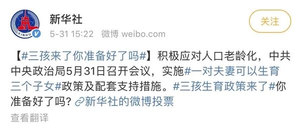 近日,新华社报道称,为了积极应对人口老龄化,中国中央政治局作出决议,将进一步优化生育政策,实施一对夫妻可以生育三个子女政策及配套支持措施,以此改善我国人口结构。