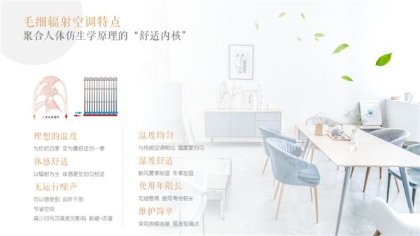 毛细辐射空调系统,以水为循环介质的一种辐射式空调末端形式,主要是通过辐射方式进行换热或换冷,如同人体的血液循环一样,通过水在极细的毛细管内流动来进行能量交换,为房间供暖或制冷,是一种高效、节能、环保的温度调控方式。避免了传统空调的吹风感,家里的宝宝和老人再也不用担心室内温差过大,夜间着凉的问题了。